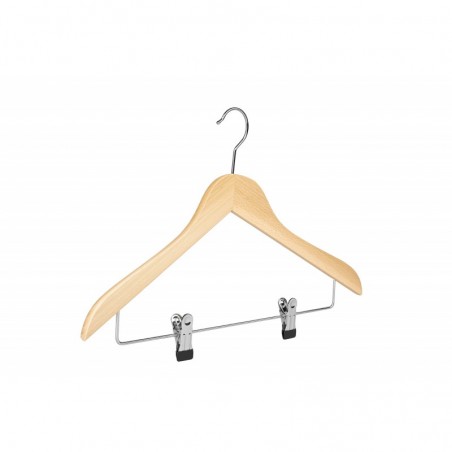 gewinkelter Massivholzkleiderbügel, Buche natur lackiert, aus hochwertigem Buchenholz in Europa gefertigt, stabiler Kleiderbügel mit einem Klammernsteg classic clip ausgestattet, die Enden der Clips sind mit transparenten Enden überzogen, die Auflagefläche beträgt 13mm, Länge 45mm Kugelhaken 3,4mm silberfarbig glänzend