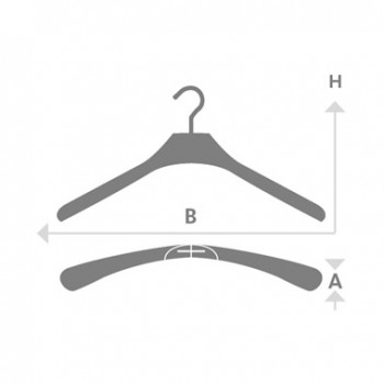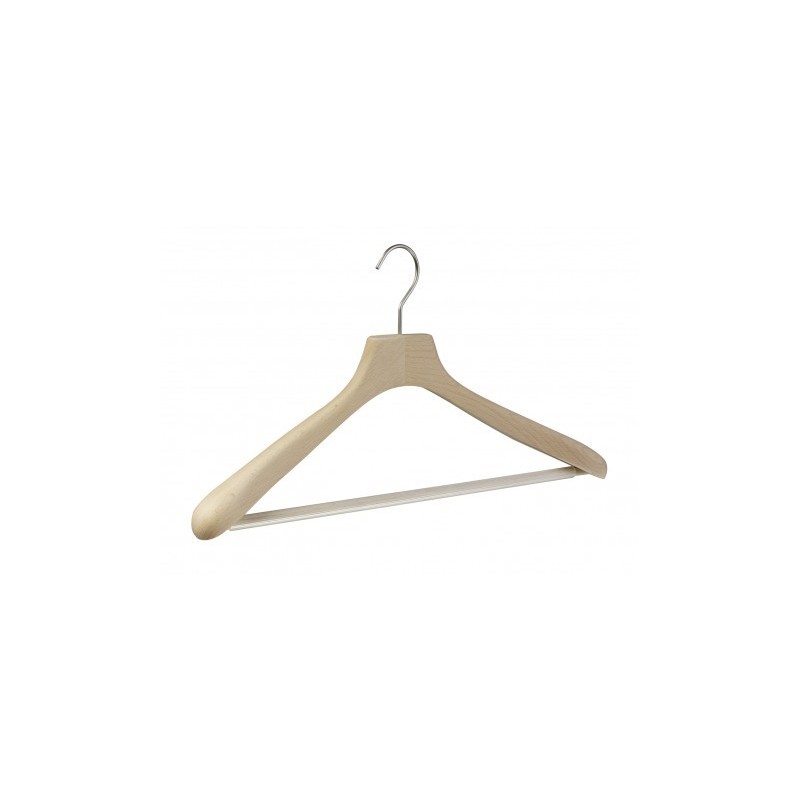 gebogener Massivholzkleiderbügel aus Buchenholz, für die Präsentation von hochwertigen Anzügen ist dieses Modell die perfekte Lösung, durch den transparenten Riffelschlauch über dem Hosensteg wird das Herunterrutschen einer glatten Hose verhindert, Spannweite 45cm, Auflagefläche 40mm, ausgestattet mit einem schlichten 4,0mm Haken matt vernickelt ohne Kugel