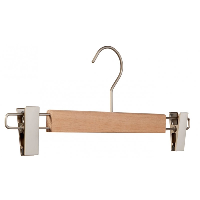 flacher Clipbügel aus Buchenholz, mit matt vernickeltem new clip (Clipmaß 60x20mm), um Geräusche beim Verschieben der Klammern zu vermeinden sind die Klammern mit kleinen Plastikbushes ausgestattet, der 4,0mm Haken mit matt vernickeltem Finish ohne Kugel rundet das schlichte Design ab